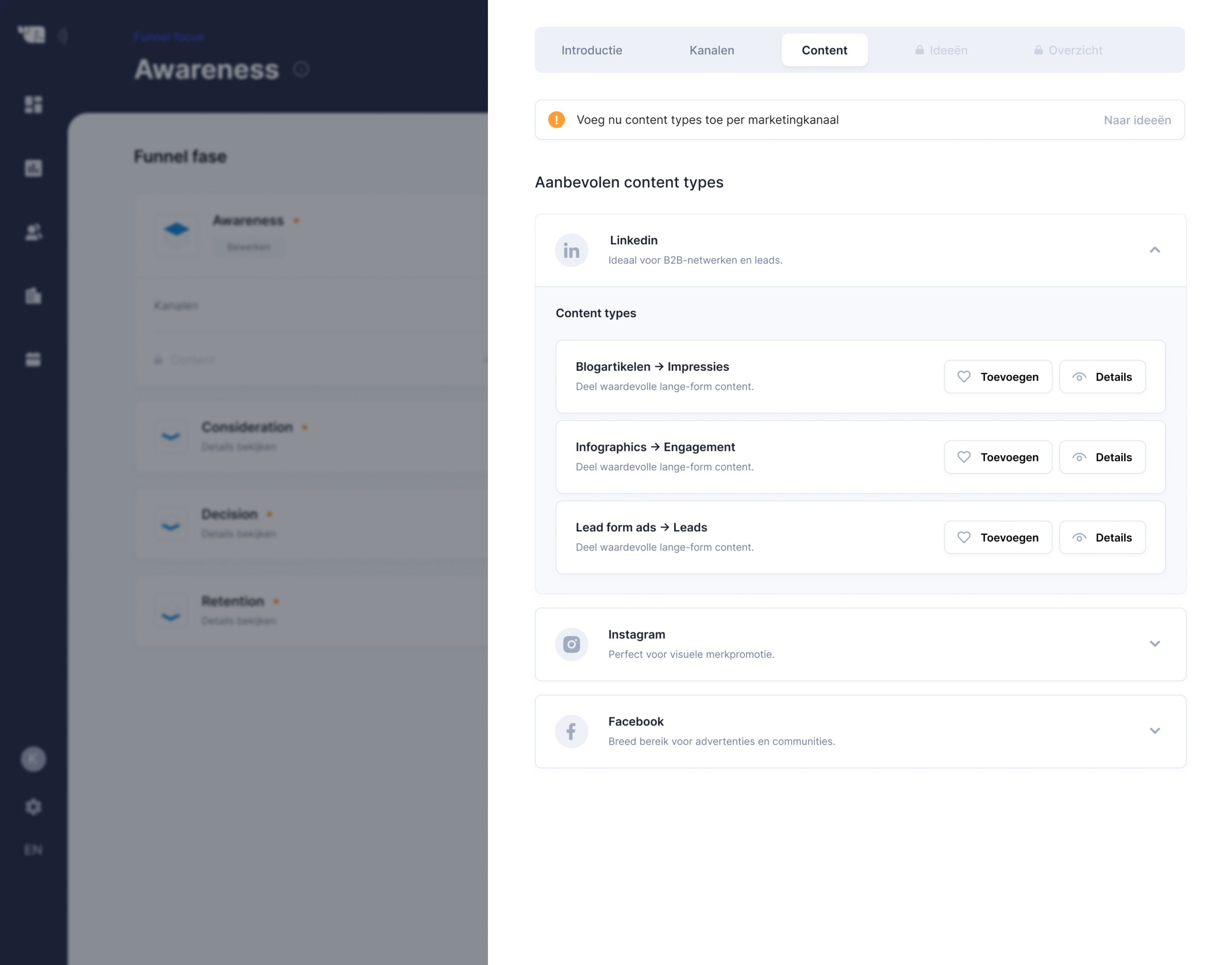 This included defining the overall product structure, designing user flows, shaping functional modules and translating complex logic into an intuitive experience that guides users through planning, creating and optimizing their marketing activities.